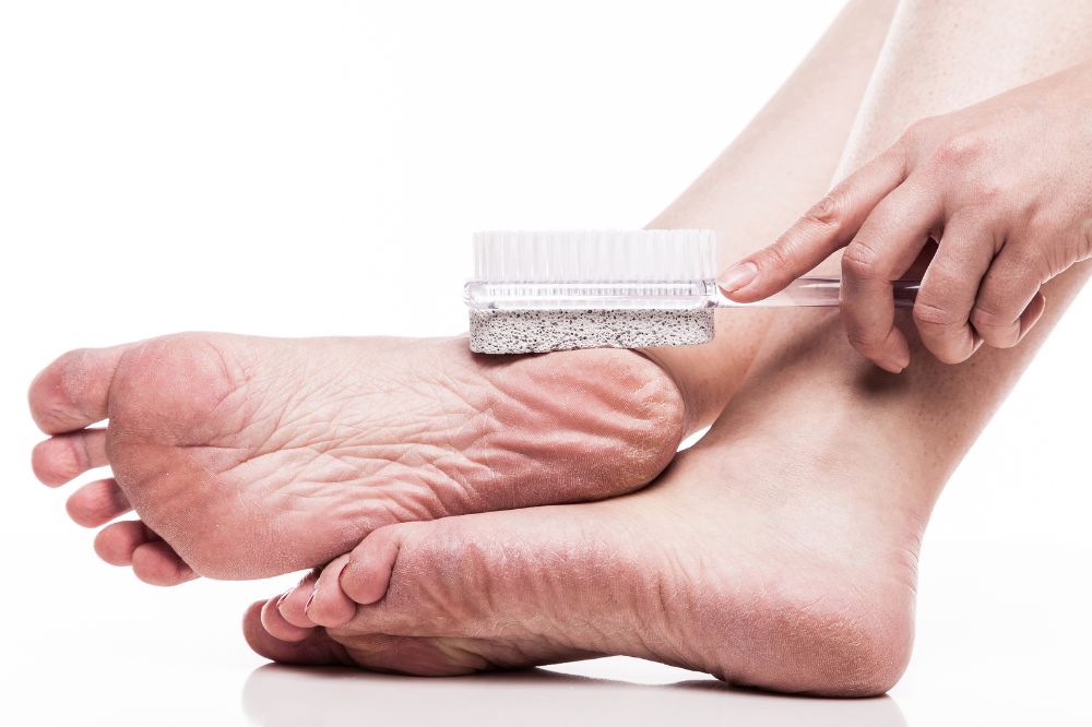 Before exfoliating your feet, give them a good soak in lukewarm, soapy water and scrub away the dry and hardened skin using a dedicated foot scrubber or pumice stone.
